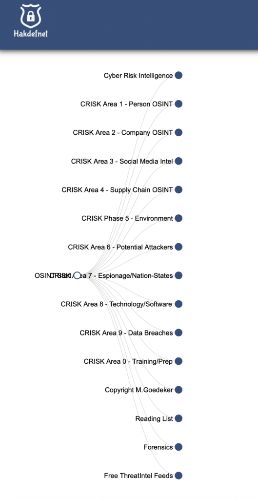The CRisk framework has 11 major areas and we are offering a training course that teaches anyone to use the CRisk framework which also includes components from the OSINT framework and turns this framework into a more practical approach for analysis and reporting with links that actually work and follow a step by step process. You can view the free and subscription components at https://osint.risk-intel.com